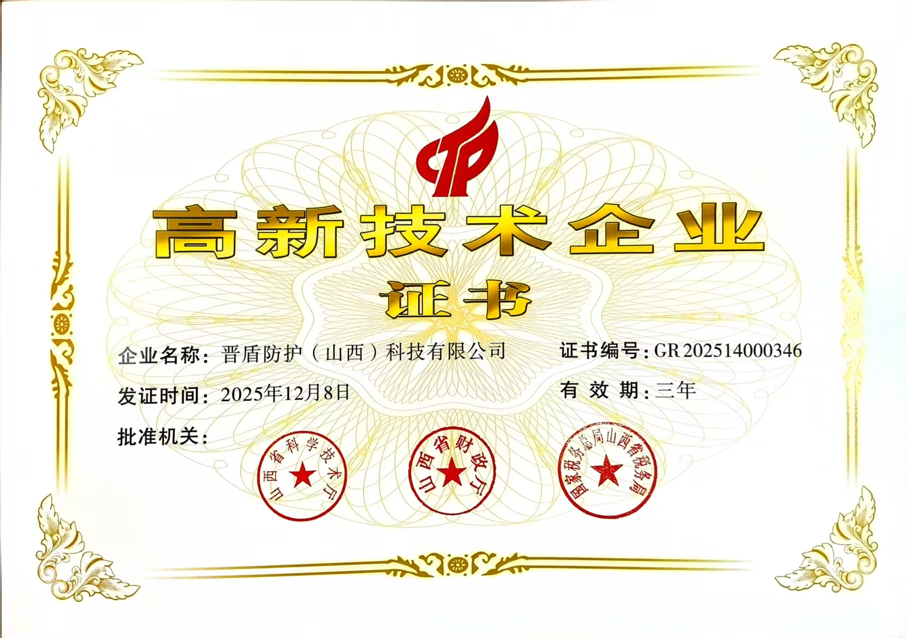 近日,晋盾防护(山西)科技有限公司顺利通过国家高新技术企业认定,斩获国家级“高新技术企业证书”,标志着公司科技创新实力获国家权威认可。