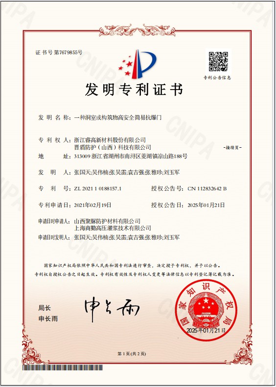 2025年1月21日,晋盾防护(山西)科技有限公司传来重大喜讯——由我司主导研发的《一种洞室或构筑物高安全简易抗爆门》技术,正式获得国家知识产权局发明专利授权。这项创新成果不仅彰显了企业在安全防护领域的深厚积累,更为地下工程、特种建筑等领域的安全防护提供了划时代的技术方案。