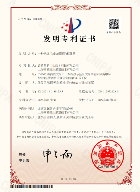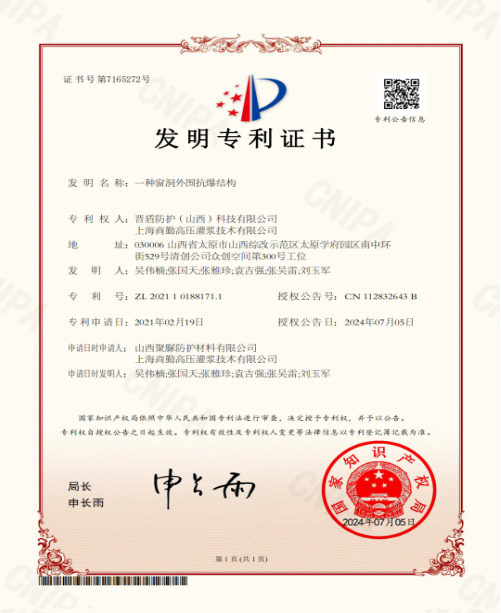 7月5日,由晋盾防护(山西)科技有限公司和上海商勤高压灌浆技术有限公司共同申请的两项抗爆改造发明专利正式获得国家知识产权局授权。