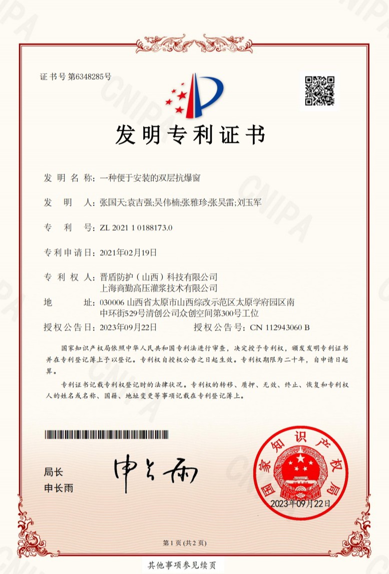 8月30日,由晋盾防护(山西)科技有限公司和上海商勤高压灌浆技术有限公司共同申请的《一种便于安装的双层抗爆窗》发明专利正式获得国家知识产权局授权。