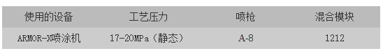 本材料需通过高压喷涂机进行喷涂(推荐首选ARMOR-X喷涂机)。高压喷涂设备必须具备材料的热控制能力,其材料用量体积比为1:1,能使用圆形或扁平型等各种喷嘴进行喷涂操作。有关设备细节问题及其配件问题,请咨询设备制造商。